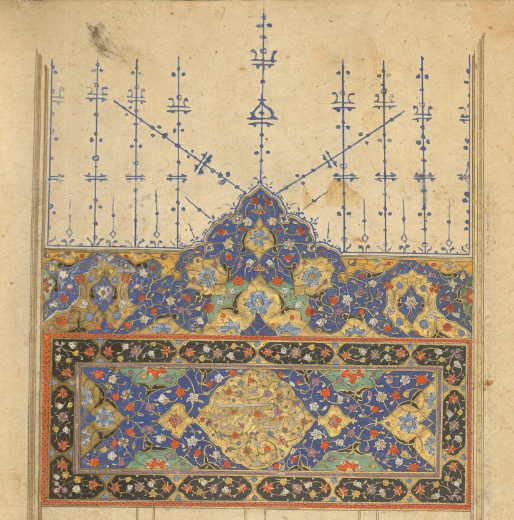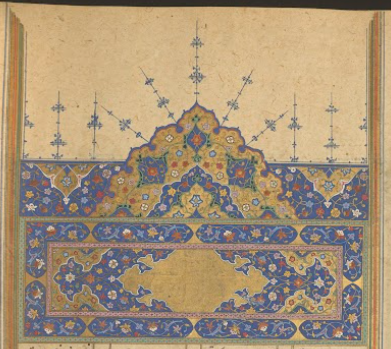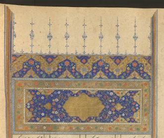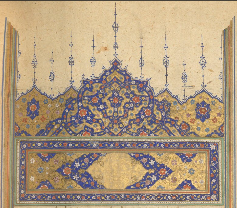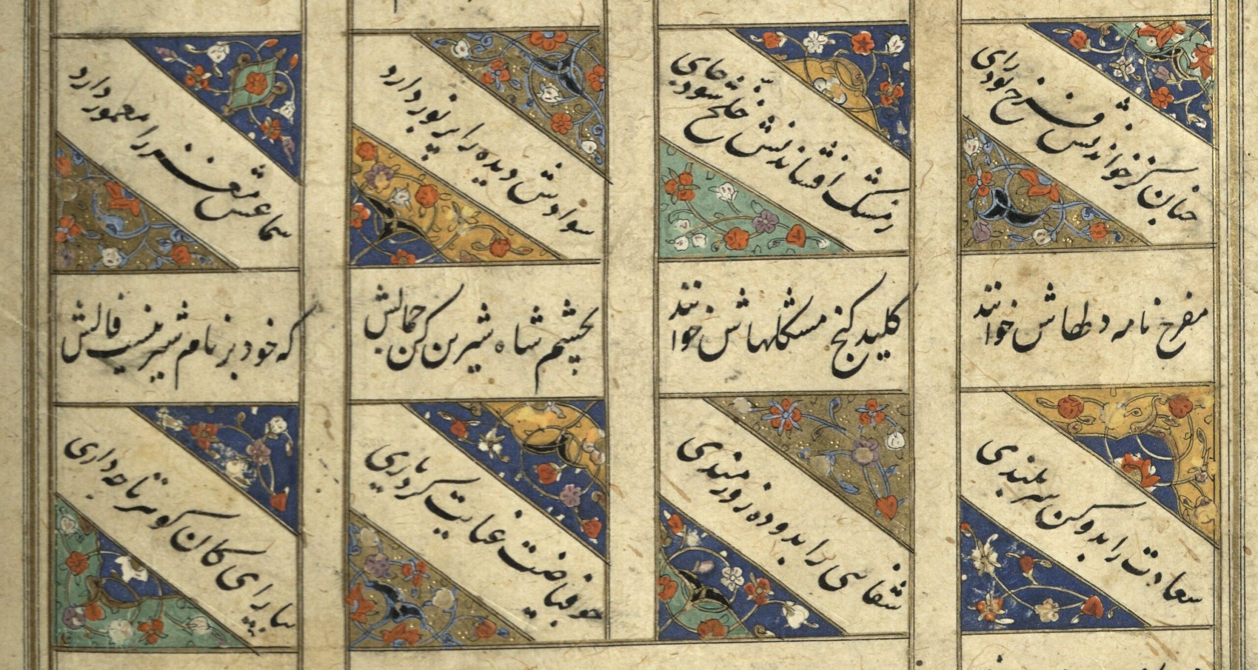 Since this is poetry, it is most commonly written in couplets of two hemistichs that you read across the page (not down the column). So, those tilted lines on the right page above are read across as any line would be, they are just written at angles to take up more space on the page. The spacing continues on the next page, but without the colorful floral infill. Instead, the gold and blue rulings will continue until the end of the poem. The angled lines are to control space and the line placement on the page so that a line related to an illustration will end up in the correct place for that illustration, i.e., at the top of the page with the illustration.