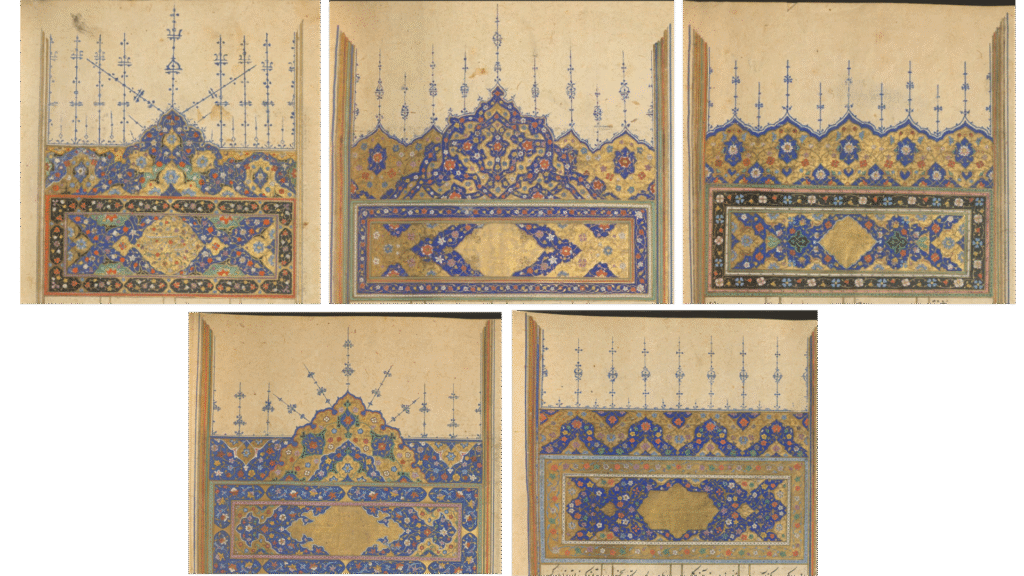 As with many copies of this text, each of the five poems is given a headpiece decoration, called an unvan, at the beginning of the first page of the piece (above). I like in these informal pictures how you can see the gold reflecting the light. You can furthermore see how it is sometimes quite difficult to read white ink on a gold background, such as you see in the middle of the main rectangle of the headpiece, here. That combination of white on gold is quite common, but it can make reading the titles extra tricky with the reflecting light. It is actually much easier to see if you are working with professional digital images since the glare of the gold is mostly gone in such photos. Notice how the decoration in the headpiece is reminiscent of the previous dual-page opening. The same colors and similar shapes are present, but they are arranged differently (look at the black band, for example; it is present, but shaped differently). That is the case for each of the headpieces in this copy. Of the five poems in this collection, only Khosrow o Shirin, the second work (pictured above), has the title written into the headpiece. The others have the same styles and colors but different patterns and blank central cartouches (see all five together below).