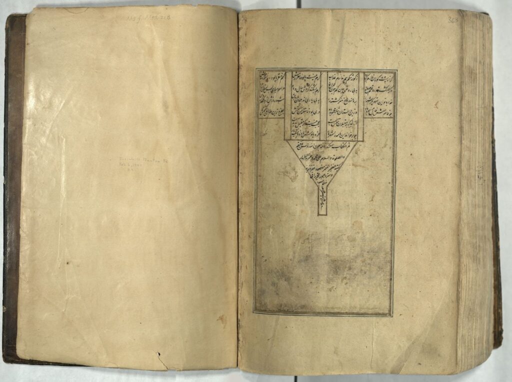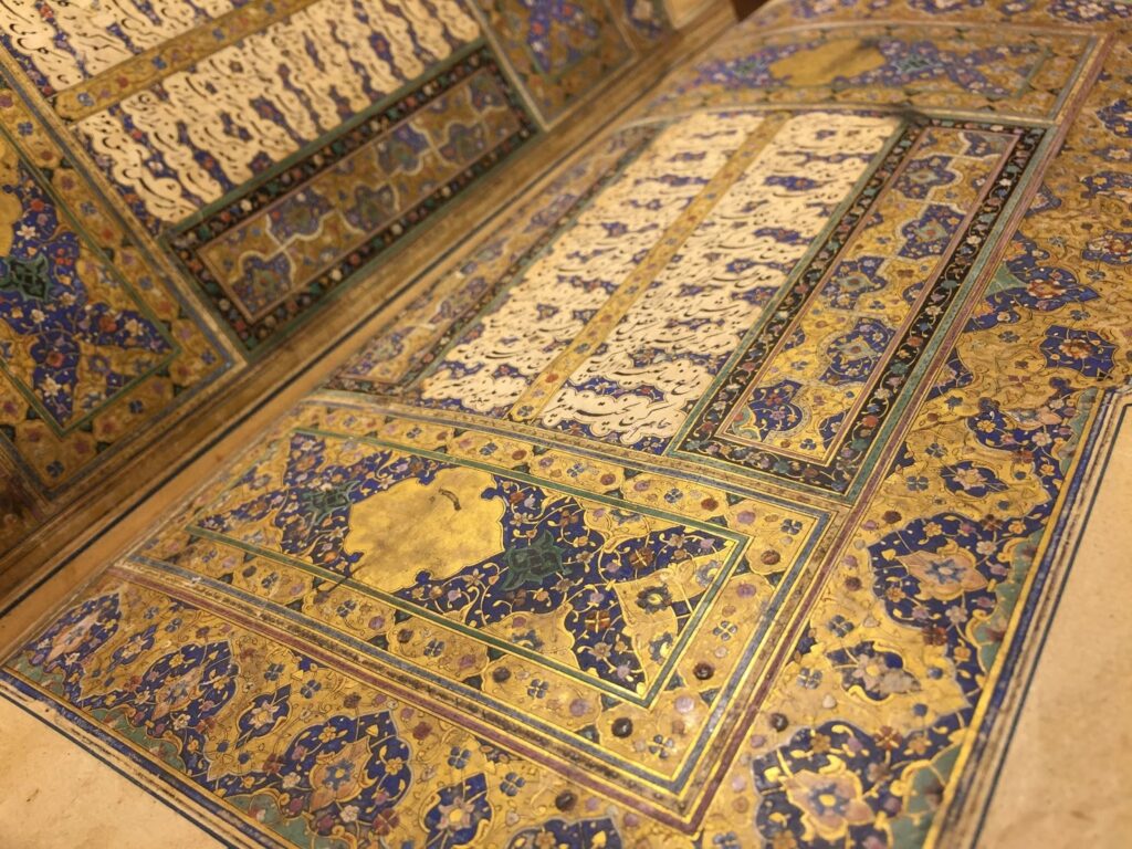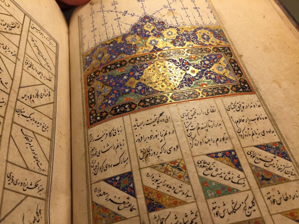 Let’s conclude this brief tour with a look at the colophon for this copy. The colophon (the ending of the book where you sometimes get copyist, date, and place information) below, gives the scribe’s name, Maqsud, and the date: the month of Dhu al-Qa’dah 961 H or October 1554 CE. There is a similar triangle-shaped conclusion to every other section of text in this copy, but unfortunately no more information about the scribe or the dates of completion for the sections appears. Instead, the scribe simply says “this is the end of [insert title here]”. You may also notice in the image below that the paper is quite burnished. You can see it reflecting the light, especially on the upper left page. That is common for Islamicate manuscripts and sometimes the pages are so highly burnished that they make a rather pleasing crackling noise as you leaf through the manuscript.